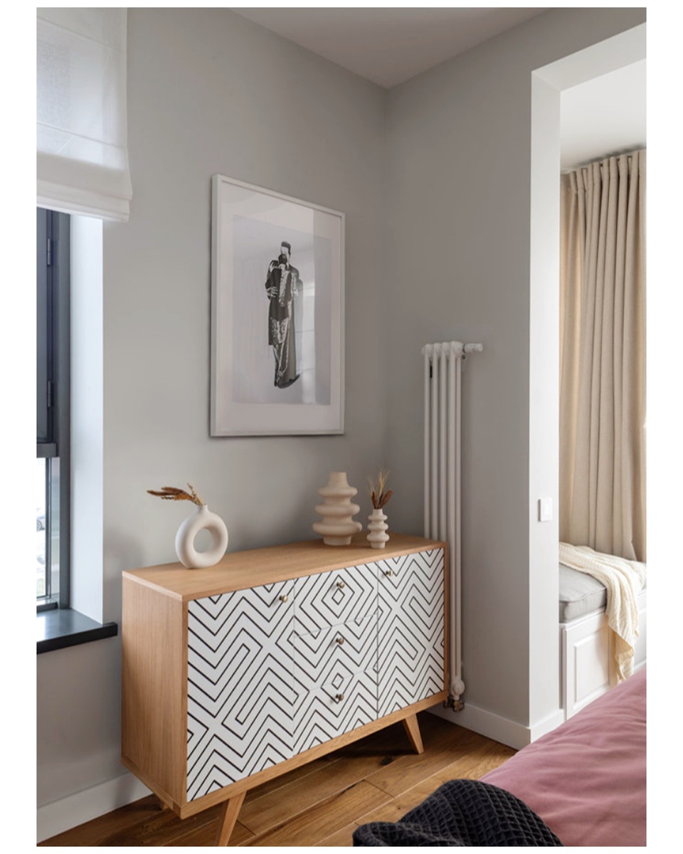 Помещение изначально было довольно большим для спальни - 20 квадратов. И дизайнер не хотела захламлять его лишними предметами, поэтому в спальне минимум мебели и много воздуха.