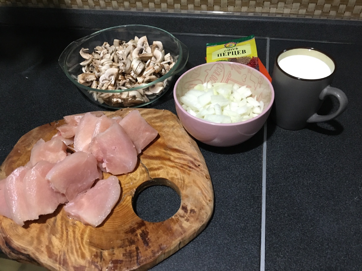 - нарезаем грудку пяточками, режем мелко лук и грибы кусочками