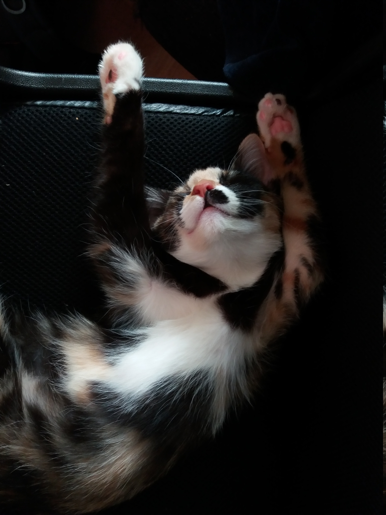 "Разве можно купить счастье за 100 рублей?" - спросите вы. Я отвечу: "Можно!!! С доставкой на дом!!!" Этот год был годом потерь....в июне ушла на радугу наша любимая собачка. Сгорела за 2 месяца...боролись до последнего: капельницы, стационар, обследования...Кормила я её по часам, записывала какие таблетки давала, сколько, когда поила. Наша Лапочка уже не пила и не ела самостоятельно. Ночью с мужем дежурили по очереди. Я с малышом (у нас сынок родился), он за Лапочкой смотрит. Удавалось поспать по 2 часа... потом опять на процедуры. Хорошо было лето... старший сын с коляской гулял с малым вокруг ветклиники, пока я на процедурах с Лапушкой. Но ничего, мы же сильные, думали мы, справимся...И справились бы, если бы не такая тяжёлая форма онкологии гипофиза у собаки. Врачи сами развели руками и сказали, что ничем больше помощь не могут. Принять это было невозможно...но жизнь всё поставила на свои места...Сказать, что мы были убиты горем - ничего не сказать!!! Мы пытались научиться жить по-новому, но это плохо получалось...Поэтому в одних из вечеров было принято решение взять зверушку домой, но кого и какую? Муж хотел щенка, но я понимала, что всё ляжет на мои плечи, а щенок - это дело ответственное, как ребёнок. А так как у меня на тот момент уже был грудничок, я была против!!! Решили остановиться на котейке обычной, беспородной. Хотелось взять бездомную...хоть, кому-то помочь в этой жизни) Просмотрели кучу объявлений и вот муж мне показал её... нашу козявочку с большими испуганными глазёнками. Котейка космического окраса. Позвонили, расспросили о ней. Оказалось, что она бездомыш и ей очень нужна семья, а нам очень нужна она! Вот так иногда сходится жизненный пазл) И тут нам предлагают её привезти прямо на дом!!! Конечно, же мы согласились. Мася к нам приехала в этот же день вечером! Какая же она была маленькая, дикая и очень напуганная....вот так в нашей семье появилось счастье, купленное за 100 рублей! А что произошло дальше читайте в следующих статьях...
