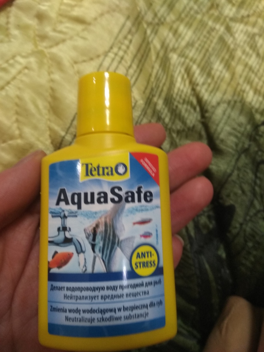 Нам людям не знающим как обращаться с рыбками , не подсказали того, что прежде чем покупать жителей(рыбок), необходимо отвезти аквариум домой, все промыть и запустить его на сутки БЕЗ РЫБОК!!!.Но на тот момент мы и не подозревали об этом . Удачно выбрав себе новых питомцев и отправив их в пакет с водой, в одном из магазинов , нас все таки направили на истинный путь. Оказывается, запустить за час аквариум невозможно, да и воды фильтрованой у нас не было.Ребенок Услышав приговор на кассе ,о том, что рыбок мы не берём, просто расплакался , но на помощь нам пришел консультант. Пожалев ребенка, он посоветовал два флакона , с помощью которых мы запустим аквариум в этот же день (вернее уже поздний вечер). Поделюсь с вами этими чудо средствами. Одно называется AquaSafe делает водопроводную воду пригодной для рыб.