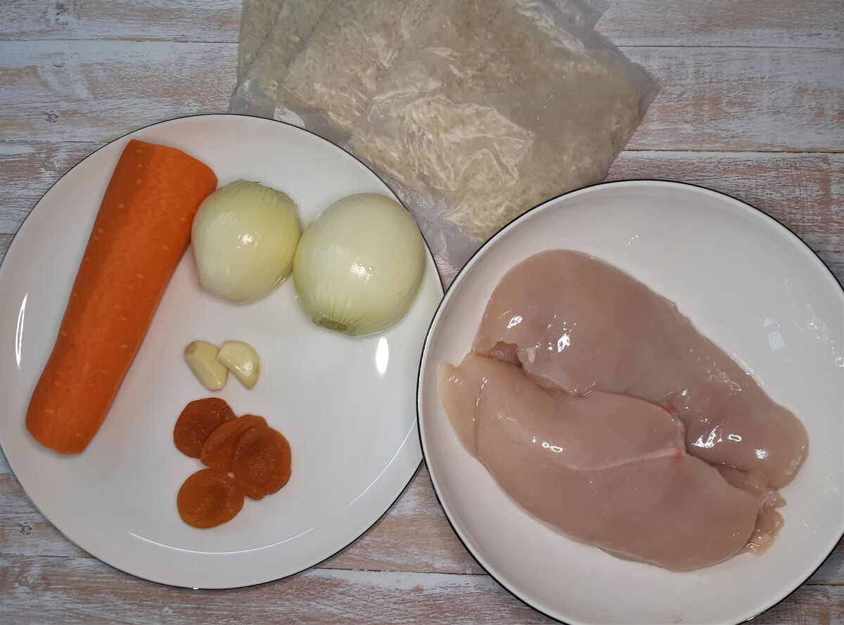 Морковь трем на крупной терке. Лук, чеснок, курагу режим мелко. Куриную грудку – на кусочки по 1 см.