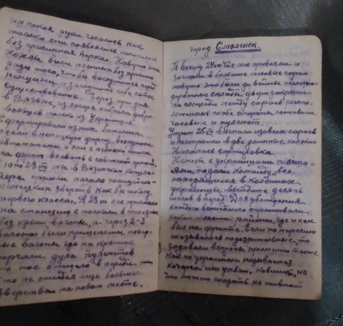 Через несколько часов х***ов [украинцев] повели получать пищу. Они с полными котелками гречневой каши и булкой хлеба на двоих возвращались в весёлом настроении, с улыбками на лицах. Когда с ними закончили, открыл полицай и нам ворота. В колонну по три повел нас к кухне. Я шёл в третьем ряду. Когда подошли к котлу, повар, тоже украинец, стал наливать в наши котелки по консервной банке ленного* [льняного] отвара и гнать от котла. Мы учинили скандал: "Почему [им] кашу и хлеб, а нам опять эту срамоту? Давай хлеб и кашу!". Тогда повар взял потяжелее черпак и стал бить нас по головам, приговаривая: "Вот вам хлеб, а вот каша!".