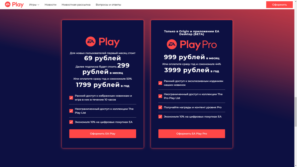 Подписка за приблизительно 3,9 долларов, 124 гривны или 299 рублей (в первый месяц 69 руб.) в месяц предоставляет вам следующие: ранний доступ к избранным новинкам и возможность поиграть в них на протяжении 10 часов, не ограниченный доступ к коллекции игр, в которые вы сразу сможете играть не покупая их, скидка 10% на электронные покупки игр от Electronic Arts .