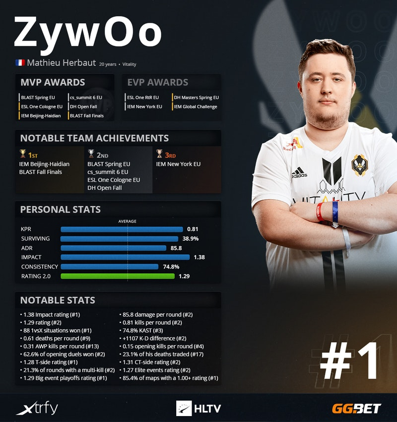 20 лучших игроков 2020 года в дисциплине Counter-Strike:Global Offensive по версии портала HLTV.org возглавил Мэтью "ZywOo" Эрбо. И хоть администраторы сайта признавали, что в этом году разрыв между первым и вторым местом, которое занял Александр "s1mple" Костылев, был наименьшим за всю историю ежегодного составления рейтингов игроков, факт остаётся фактом: француз получил вторую подряд награду ТОП-1 HLTV. Но справедливо ли это? Разберем это в нашей статье.