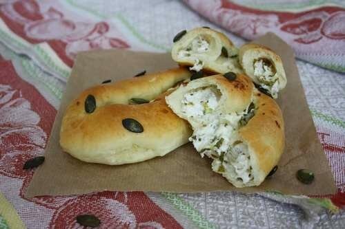 Затем тесто разделить на 8-9 частей. Из каждого кусочка теста раскатать прямоугольник, на сколько это возможно, примерно 0,5-0,7 мм толщиной. Сыр натереть на крупной терке. Посыпать сыром, немного отступая от краев. Затем с двух сторон сделать по два оборота, дважды завернуть, чтобы стороны сошлись в середине, но не склеились. Края защипнуть по 1,5 см с каждой стороны. Смазать края теста желтком, посыпать тыквенными семечками. Выпекать в предварительно разогретой духовке при 180 С 25-35 минут до готовности.
