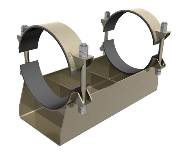 - Корпусные опоры. Крепежные элементы могут быть оборудованы плоскими (предназначены для стальных трубопроводов) и круглыми хомутами (могут устанавливаться на стальные и пластиковые трубы, а также на трубы, имеющие дополнительный изоляционный слой).