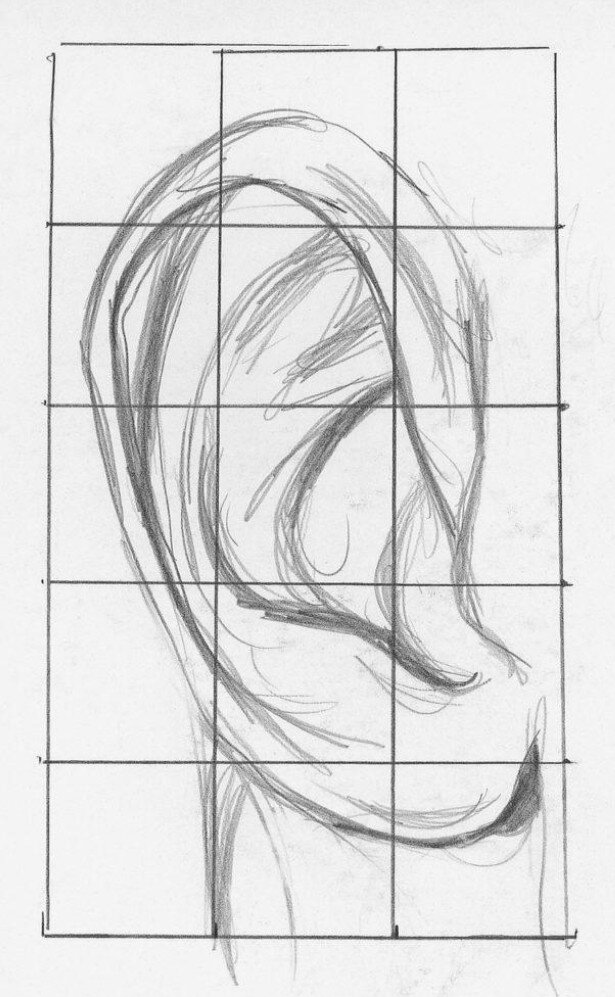 Используя разметку, карандашом нарисуйте контур уха. Оно похоже на паззл, части которого взаимосвязаны.