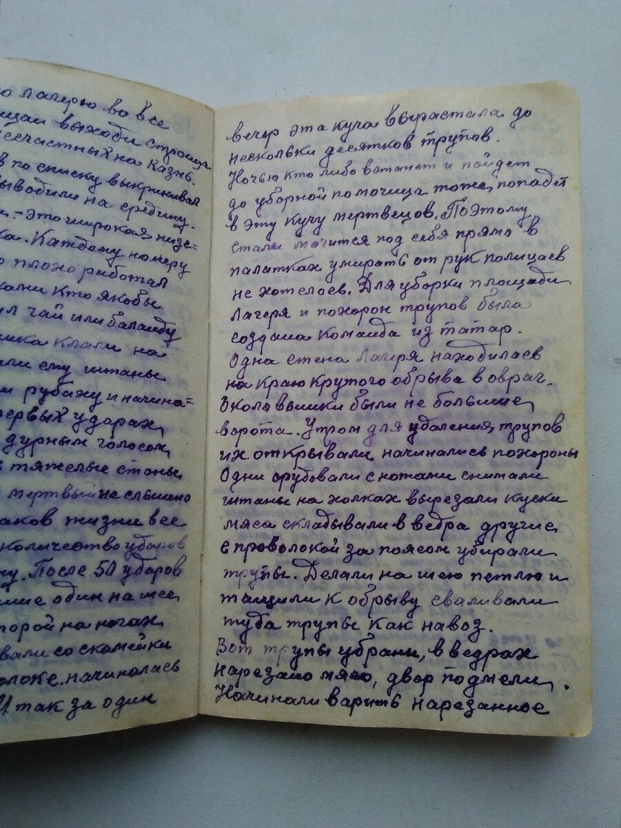 Вот, кучу тел убрали, в вёдрах нарезано мясо, двор подмели. Начинали варить нарезанное, сами не ели, а вечером, когда пленные получали еду, меняли его на хлеб. Выстраивалась большая очередь желающих поменять хлеб на мясо. Никто не знал, откуда и какое это мясо. Похоронная команда набирала столько хлеба, сколько у них было мяса. Я пытался стоять в очереди, мне никогда это не удавалось: всё не доставалось. А потом это дело раскрылось и татары были расстреляны.