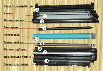 1. фотовал, фотобарабан, фоторецептор, Organic Photo Conductor – алюминиевый цилиндр, покрытый светочувствительным слоем;