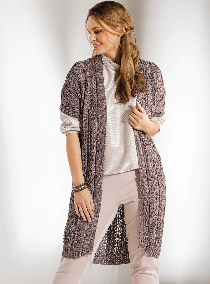 Пряжа (68% вискозы, 32% полиэстера; 115 м/50 г) – 550 (600) 650 (700) г серо-коричневой; спицы № 4 и 5; длинные круговые спицы № 4.