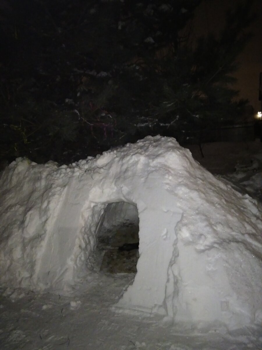 В один из снежных дней, заранее накидав кучу снега под сосну во дворе. Утром появилась возможность сделать "иглу" для ребенка :) Снега получилось очень много - и даже будучи рассыпчатым в куче он слеживается и примерзает достаточно, чтобы сделать в нем проход.