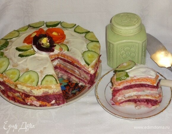Ингредиент Количество блины готовые 11 шт. свекла вареная 2 шт. морковь вареная 3 шт. картофель вареный 3 шт. яйца куриные 4 шт. майонез 21 ст. л. соль 2 щепотки перец черный свежемолотый 2 щепотки сельдь соленая 1 шт. лук репчатый 1 шт. огурцы свежие 0,3 шт.