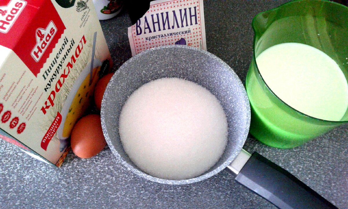 1. Смешать сахар, крахмал, ванилин в ёмкости для приготовления крема.