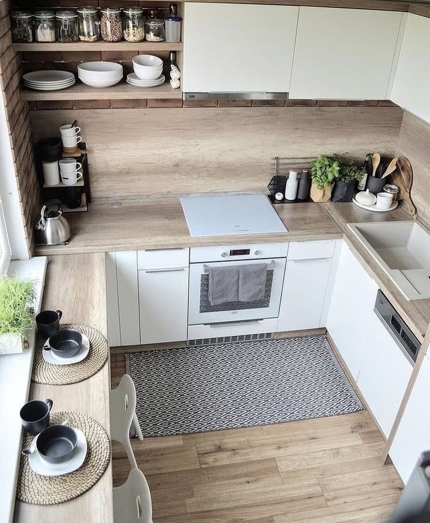 Как видите, реализовать П-образную кухню можно даже на минимуме квадратов. Поэтому если вы любите распихивать всё по шкафчикам и для вас порядок прежде всего, то пора задуматься о замене гарнитура на П-образный?