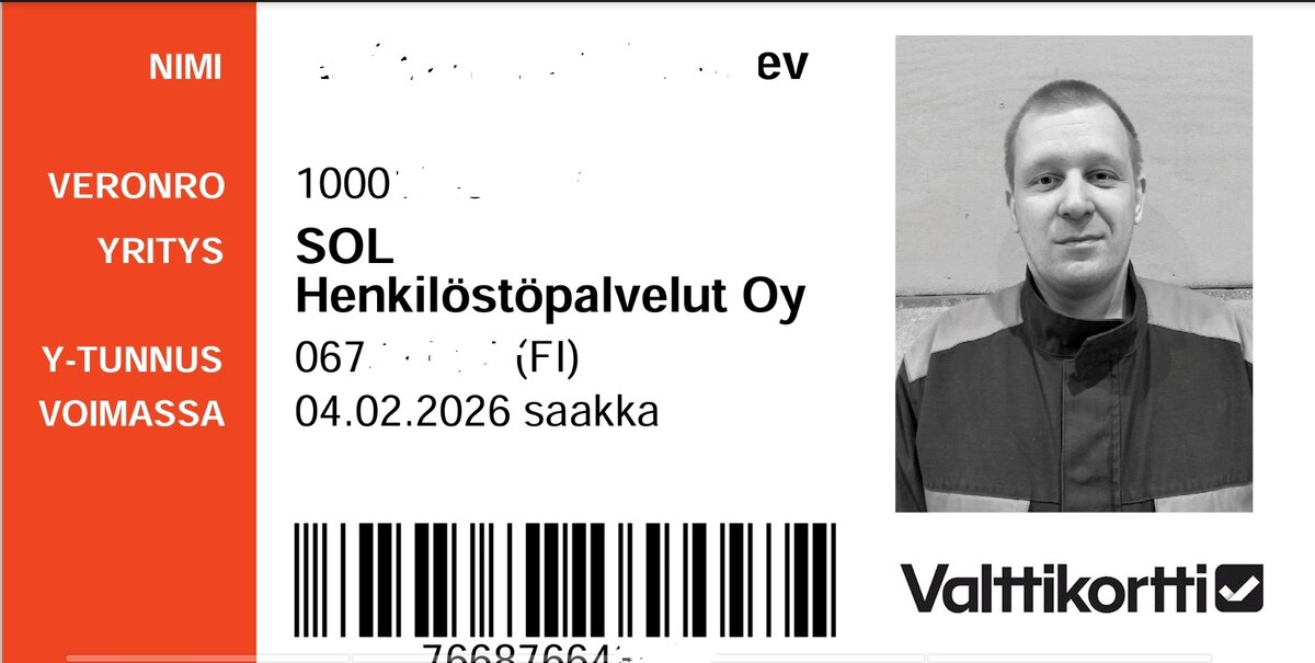 Начнём пожалуй с Valtikortti. Это чип-карта, которая служит ключом к сотрудникам на рабочем месте. На карточке указано все, что вам нужно: имя сотрудника, налоговый номер и фотография, а также работодатель. Мой работодатель сделал временную в формате картинки на телефоне, затем я получил уже в пластике. Скажем так, без этой карты Вас не пустят на стройку или какой то промышленный объект.