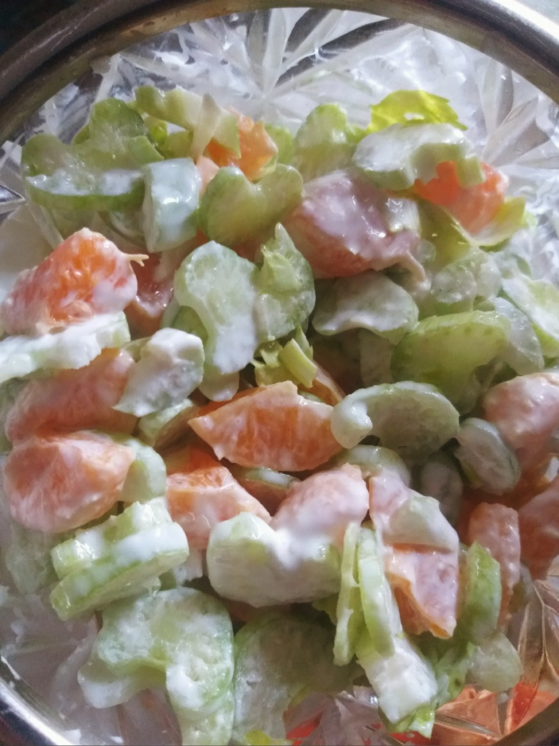 Стебли сельдерея промыть водой и мелко нарезать.Мандарины очистить от кожуры и разделить на дольки.Всё соединить в салатнице и по желанию добавить сахар.Заправить всё сметаной.Всё перемешать.Всем приятного аппетита.