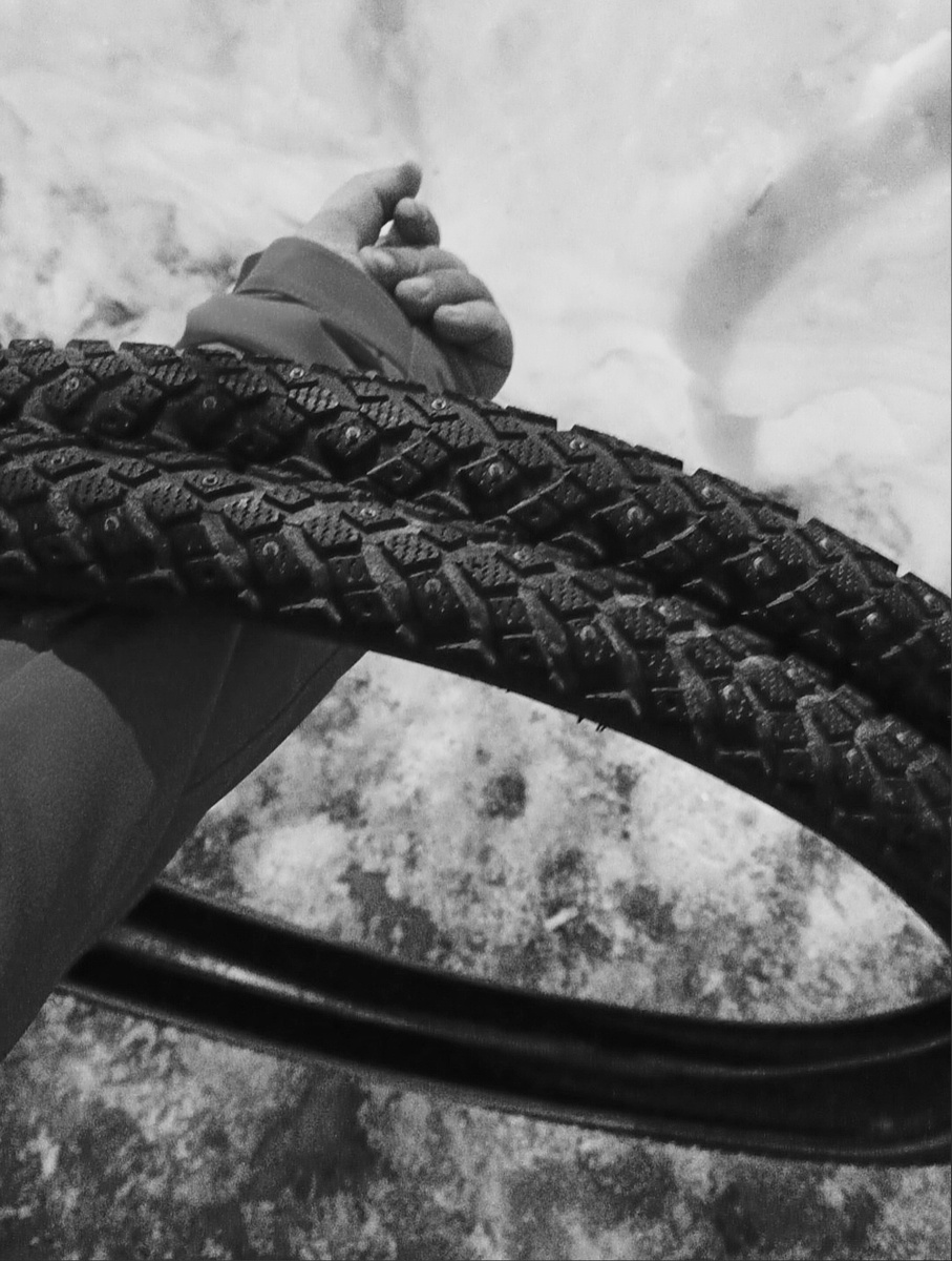 До этого мы всю зиму катались на летней резине, у меня стояла Maxxis Rambler. Для зимы она была так себе: сцепление было никакое, мелкий протектор быстро забивался снегом, на любой косой поверхности колесо просто соскальзывало. В общем, ездить можно было. Особенно тем, кто любил страдания в виде зимних покатушек на гравийниках по заснеженному городу.