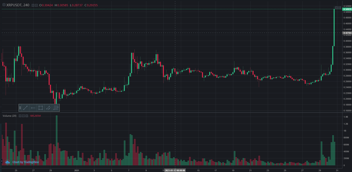Цена токена XRP от Ripple внезапно выросла более чем на 60%, преодолев рубеж в $0,5.