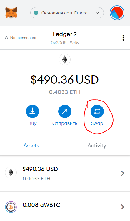 В прошлый раз мы просто отправляли криптовалюту на иной кошелек, а сегодня поменяем один токен на другой прямо через Метамаск. Для этого воспользуемся встроенной функцией Swap.