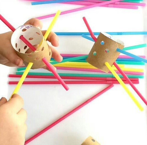 На основании валика туалетной бумаги сделайте кружочки по размеру трубочек. Готово! Получается за 7-10 минут! Теперь малыш должен вставить трубочки от отверстия валика. Развиваем мелкую моторику и учим цвета.