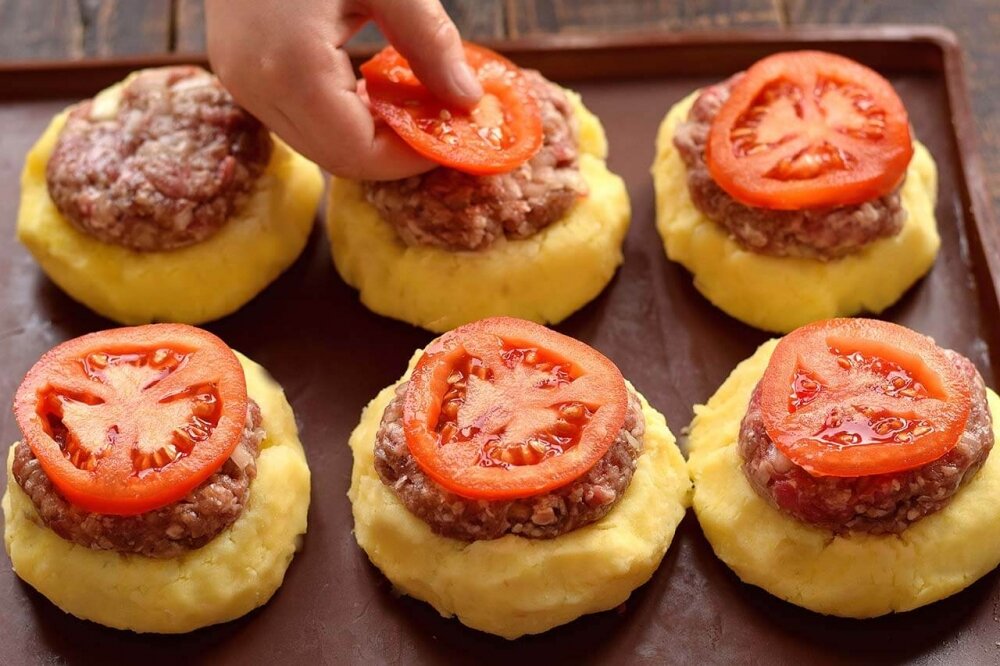 Готовим вкусный и сытный обед для семейного стола. Обычное картофельное пюре с мясной котлетой оформляем в одно оригинальное блюдо, запекаем его в духовке. Для сочности добавляем помидор и большое количество сыра — в картофельное тесто и в качестве присыпки. Мясной фарш можно сделать из любого вида мяса на выбор. Такое порционное блюдо очень удобно подавать на стол.