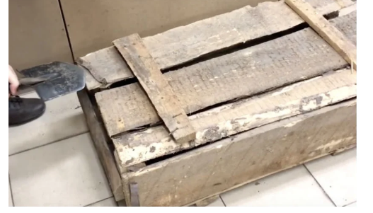 После завершения сделки, мы решили сразу приняться за работу. Во время уборки под мусором стоял старый ящик с советских времен. В надежде, что в нем находится что-то стоящее, мы схватили его и понесли к другу на работу. Инструментов под рукой не было, поэтому пришлось вскрывать лопатой.