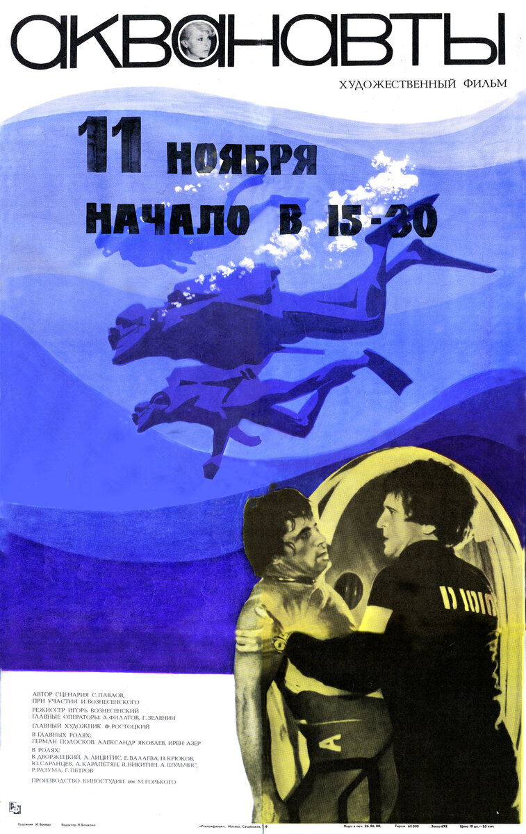 [1] «Аквана́вты» — советский художественный научно-фантастический фильм 1979 года, созданный на Ялтинском филиале Центральной киностудии детских и юношеских фильмов имени М. Горького Третьим творческим объединением по одноимённой повести Сергея Павлова. Режиссёр Игорь Вознесенский, автор сценария Сергей Павлов (при участии Игоря Вознесенского). В главных ролях Герман Полосков, Александр Яковлев и Ирен Азер. Операторы Александр Филатов и Георгий Зеленин. Художник Феликс Ростоцкий. Композитор Евгений Крылатов.