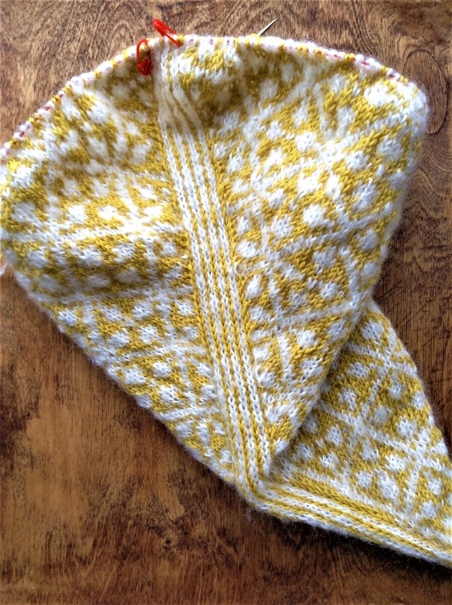 В данный момент вяжу шаль в технике разрезного жаккарда (фер-айл) и делаю пошаговое описание. Процесс выглядит сложным, но это только на беглый взгляд. На самом деле всё достаточно просто и понятно.