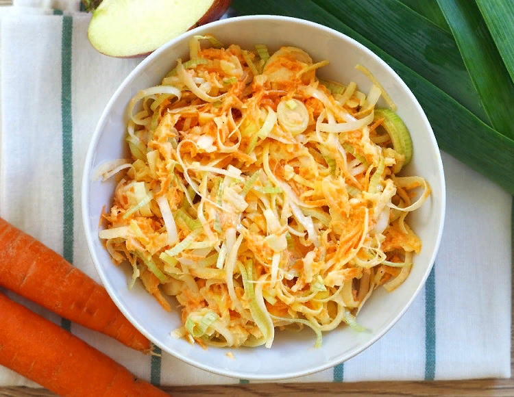 Очень простой салат с пореем, морковью и яблоками. Идеально подходит для ужина.