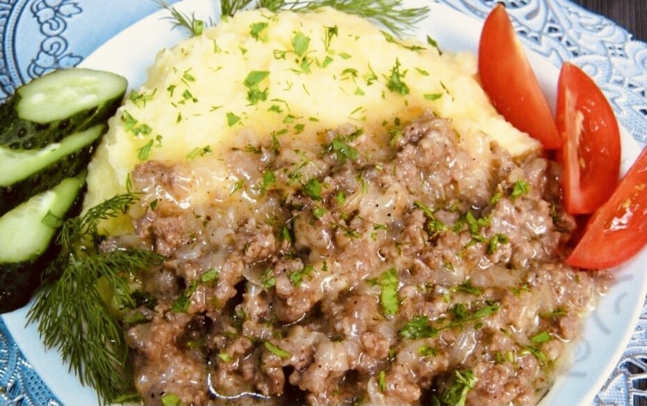 Выложите на тарелку отдельно картофель и мясную смесь.
