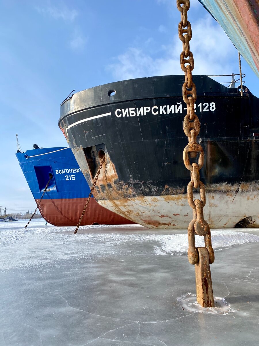 Прогулка по льду возле барж "Судоремонтного завода" в Тольятти