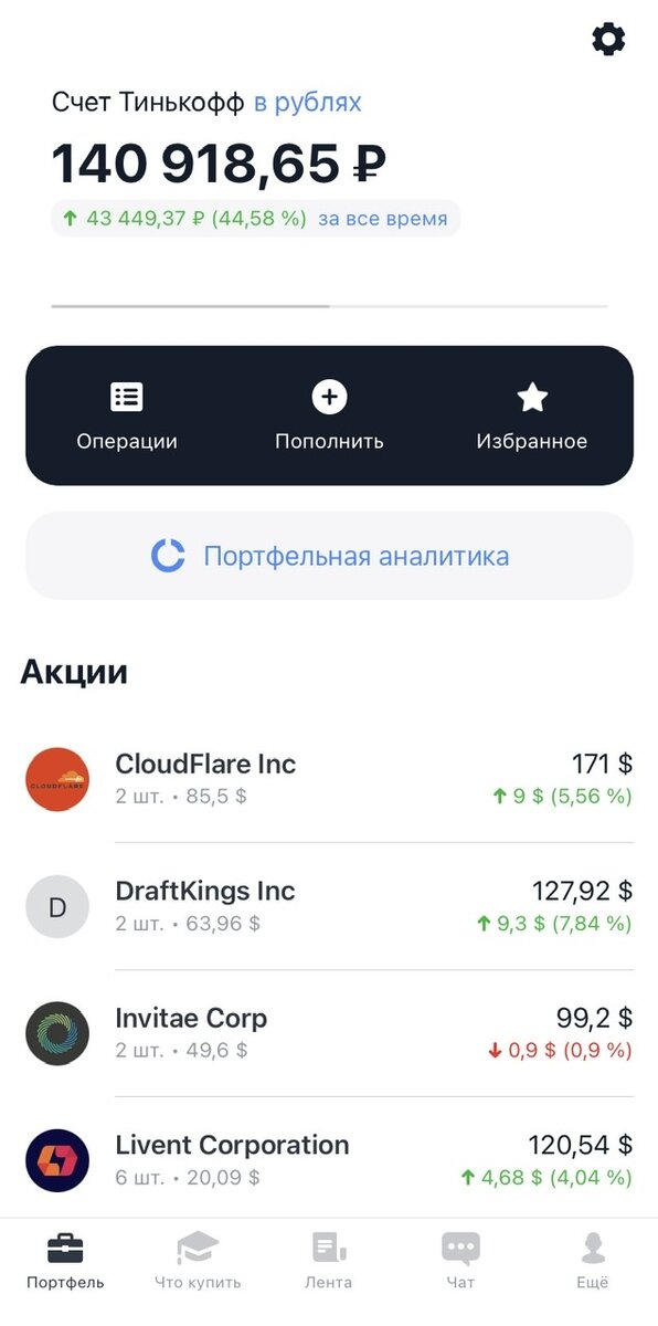 На данный момент портфель немного превышает 140.000₽ и доходность составляет почти 45%.