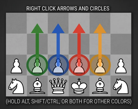 Шаг 2.4 - Переходим на lichess.org, чтобы проверить работу расширения. Попробуйте сыграть партию и нарисовать вспомогательные стрелочки не просто правой клавишей мыши, а предварительно зажав Alt. Вуаля! Вместо обычных зеленых стрелок у вас уже есть и синие! Зажав Ctrl и ПКМ, будет уже красная вспомогательная стрелка.