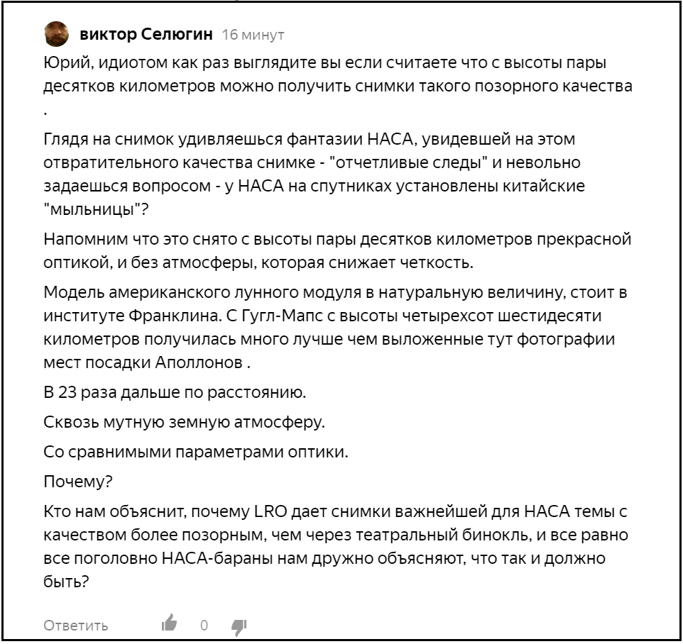 Словесное оформление может варьировать, но смысл остается одним и тем же - почему снимки, сделанные камерами лунного спутника не позволяют получить фотографии, аналогичные тем, которые делают спутники-разведчики? Почему на фото спутников-разведчиков можно пересчитать звездочки на погонах с высоты 430 километров, а на снимках LRO с высоты 50 километров не видны полосы на звездно-полосатом?