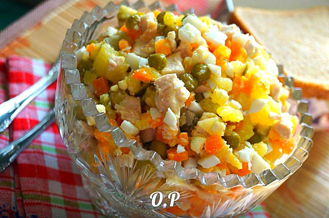 Переложить все нарезанные ингредиенты в глубокую миску,добавить зелёный горошек,соль и майонез,хорошенько перемешать до однородности,переложить в красивый салатник и подать к столу.