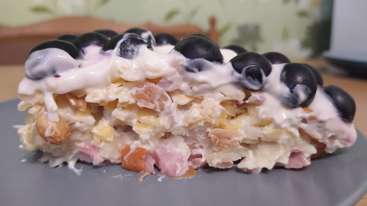 Готовим слоеный салат на скорую руку с курицей (копченые голени), арахисом.