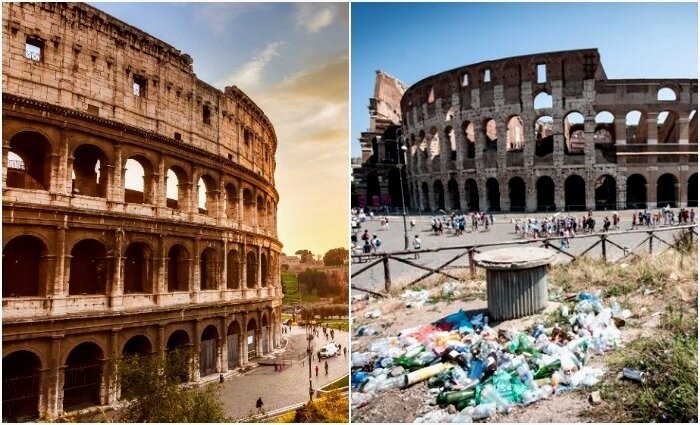 Вид старинных античных руин в Риме серьезно портят мусорные кучи. /Фото: thepointsguy.com