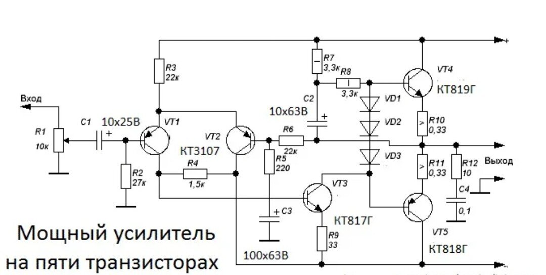 Известно, что мощность усилителей, в первую очередь, зависит всего от двух факторов: возможностей выходных транзисторов и блока питания - допустимого напряжения и тока, которые он может обеспечить. Рассматриваемый ниже усилитель звука не раз попадался мне на глаза под названием 100 Вт "на коленке". И действительно, этот усилитель на пяти транзисторах является очень простым,