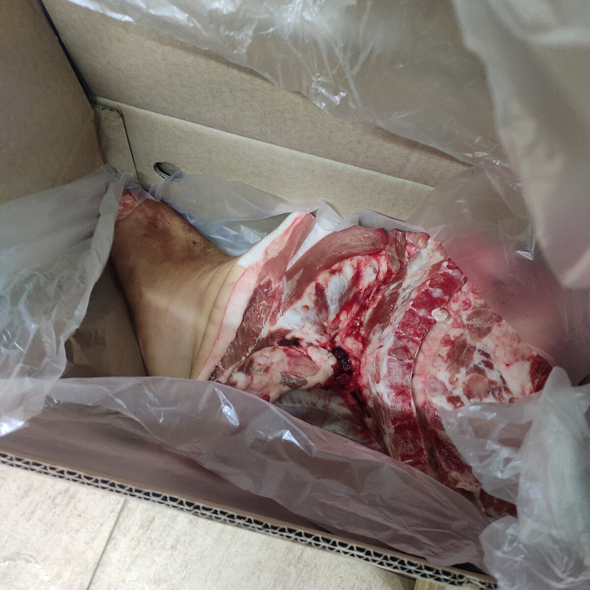 В огромных коробках в холодильном отделе лежали отрубы из свинины на кости. Видимо продают прям коробками. Цену не нашла, желтой бумажки не увидела.