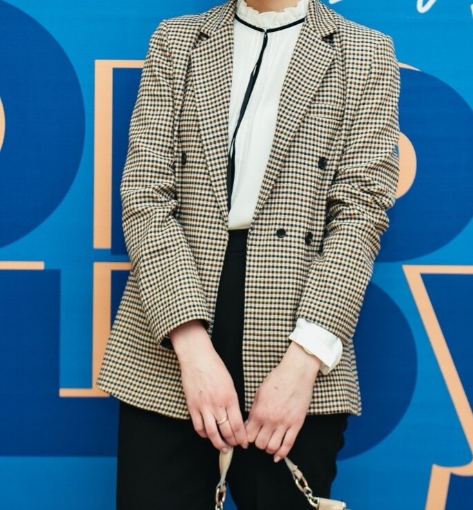 Цветовая гамма маленьких клеточки - сочетание коричневый, бежевый, синий. Однако, в зависимости от освещения пиджак, странным образом, может казаться серым, бежевым или коричневым. Цвет подкладки черный, сначала для меня это было минусом. Но когда я примерила его, подобрав несколько луков поняла, что проблем вообще никаких нет.