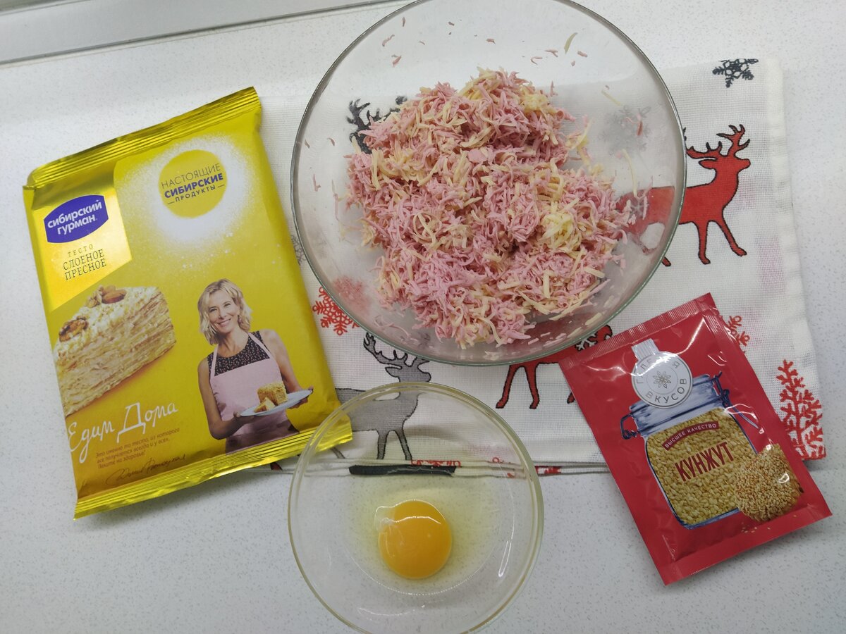 Далее в одну полосочку выкладываем нашу начинку и скрепляем края.