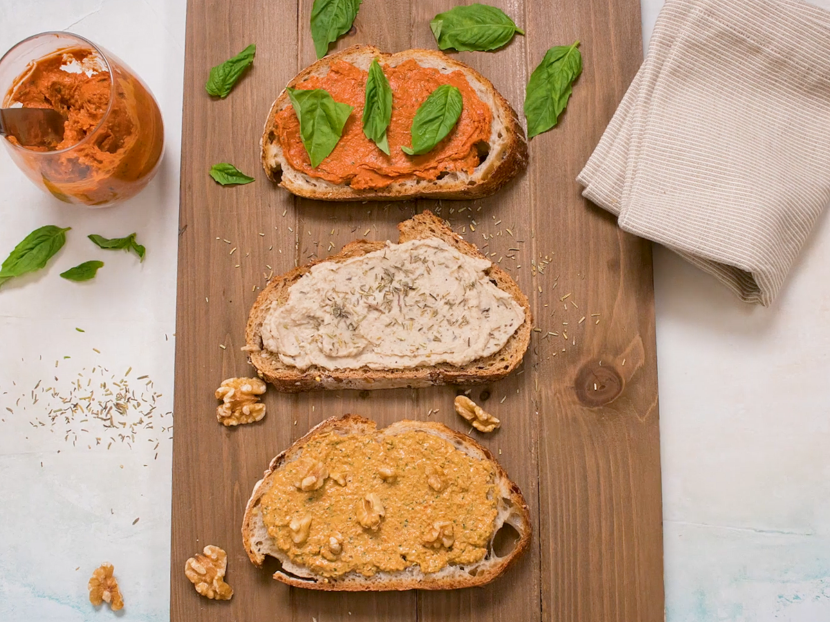 Нарезать 3 кусочка хлеба и намазать каждым видом паштета.