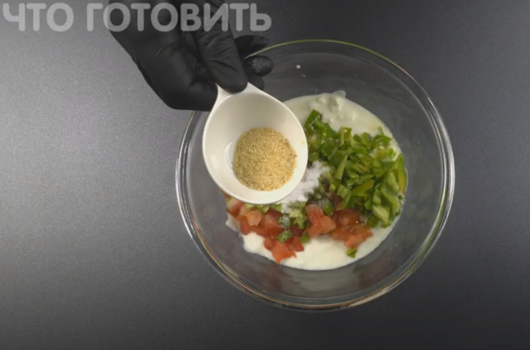 Измельчаю перец и помидор на мелкие кубики. Перемешиваю овощи и добавлю к ним густой кефир. Солю, перчу, добавляю сушеный чеснок, а пикантности придаст острая паприка.