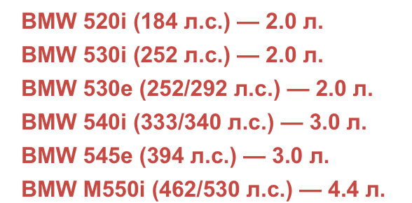 И так начнём мы с двигателя у BMW нам дают на выбор 6 экземпляров двигателя и в самой стандартной комплектации 530i мы получаем 252л.с и 2л объём двигателя.