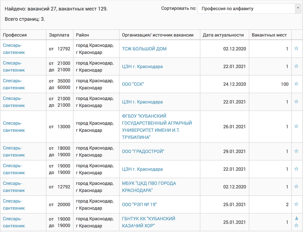 Стоит начать с того, что предлагаемые вакансии, как правило низкооплачиваемые и не по специальности. Сами работники ЦЗН не заинтересованны в том, чтобы помочь вам решить вашу проблему. Из самых популярных предложений на бирже труда, такие профессии как: слесарь, механик, сантехник, уборщик, учитель, сторож, продавец. Но оплата труда на предлагаемых вакансиях просто удивляет. Вот список подобных вакансий с краснодарской биржи труда.