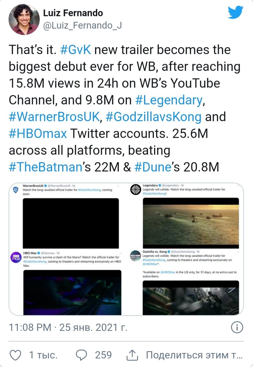 Ярким индикатором усилившейся зрительской жажды кинозрелищ стали итоги просмотров первого трейлера фантастического эпика «Годзилла против Конга». Совместный проект Warner Bros. и Legendary, перенёсший гибридный релиз на 31 марта, почти наверняка удостоится крайне пристального внимания аудитории, будь то фанаты традиционного похода в кино или сидящие на карантине подписчики HBO Max.