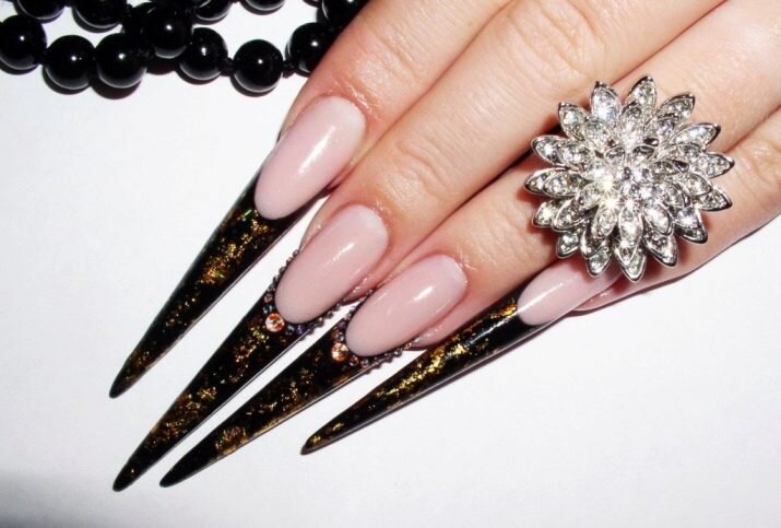 Оригинально выглядят на стилетах вензеля или геометрия , выполненные в бежево-чёрном дизайне с небольшими вкраплениями блёсток: золотистых, серебряных или радужных. Даже поклонницы минимализма могут спокойно носить «мечи» или «готику» – достаточно попробовать один из самых трендовых на сегодняшний день «маникюр без маникюра», «голый» ноготь с одним элементом дизайна, причём неконтрастной, нюдовой гаммы.