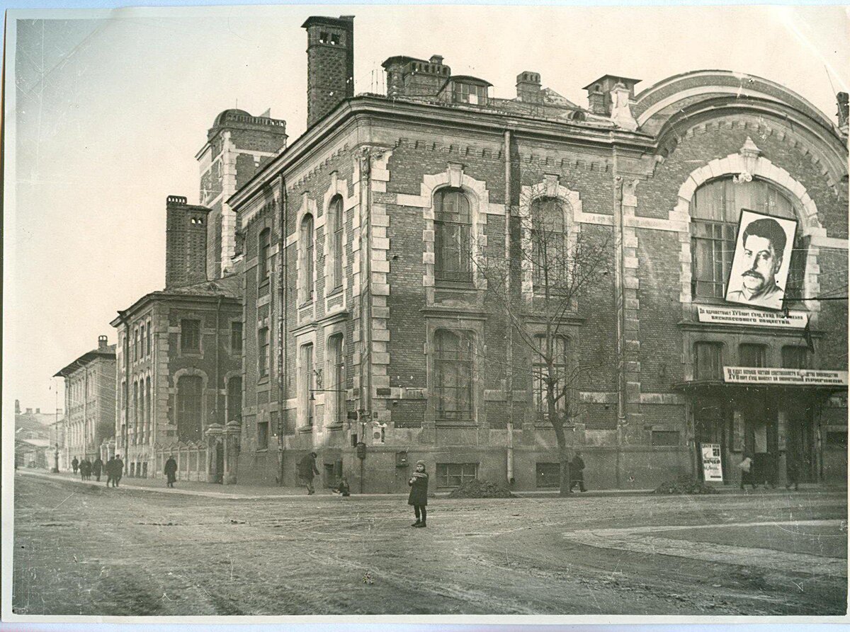 Начнём с угла Тамбовской и Прилукской улиц. Начало 1930-х годов, здесь находится ДК железнодорожников, на котором висит портрет Сталина.