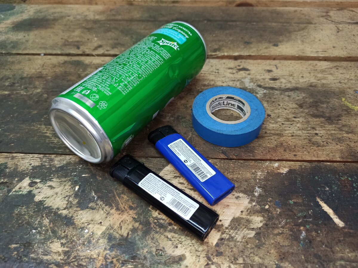 Приставляем воронку из банки к зажигалке и фиксируем всё изолентой! Конструкция на самом деле устойчивая, и ничего не болтается — можно даже с натягом наматывать изоленту, чтобы металл немного сплющился!