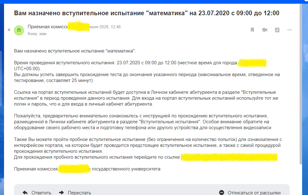 Доброго времени суток! Сегодня я бы хотела поделиться своим опытом сдачи вступительных экзаменов в ВУЗ дистанционно. Но, прежде чем начать, я бы хотела отметить, что в ВУЗ я поступала при наличии диплома СПО. Университет, который я выбрала для себя, к счастью имел возможность проводить вступительные испытания дистанционно. Отправив все нужные сканы документов я ждала июля, так как в это время начинаются все экзамены. Приемная комиссия университета извещала за пару дней о предстоящем экзамене через электронную почту. В личном кабинете абитуриента, в разделе "вступительные испытания", я также могла ознакомиться с датой проведения экзаменов. В моем случае, было нетрудно найти положение о вступительных испытаниях, проводимых университетом самостоятельно по образовательным программам высшего образования — программам бакалавриата, программам специалитета, программам магистратуры и образовательным программам среднего профессионального образования, а также инструкцию по прохождению вступите